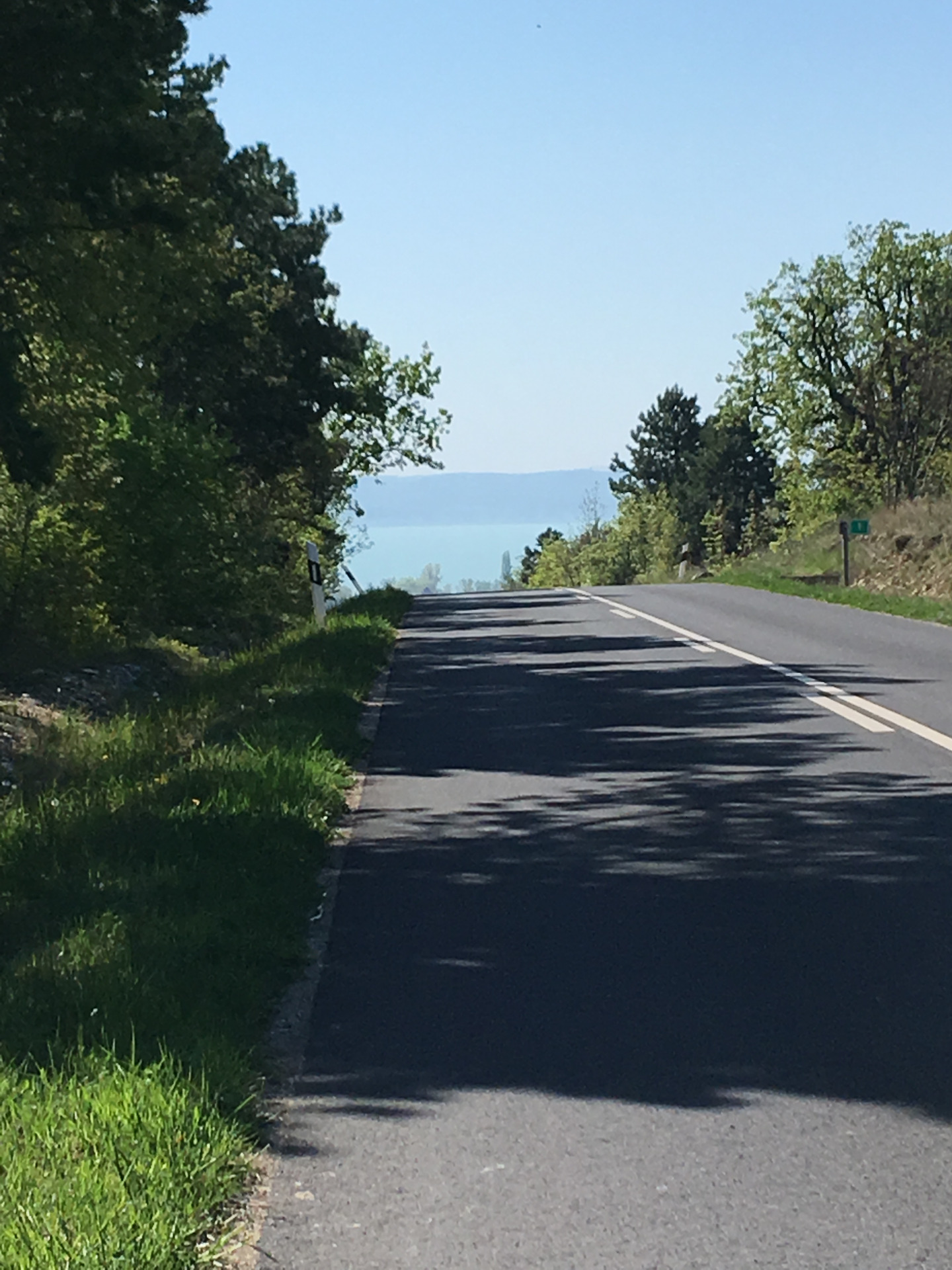 Innen már csak egy ugrás volt Dörgicse, itt bekevertem a második Sponsert, meg ettem a géleket is szorgalmasan, hogy jó legyen az energia-háztartásom. Akali felé aztán lehetett lefelé tempózni rendesen, előttem a Balaton, jobbra pedig már látni lehetett a Gulács púpját a dombhátakon túl. Ezen a szakaszon majd az UB-n is figyelni kell, hogy a tempóm jó legyen, de trappolás nélkül, hogy minél kevésbé verődjön szét a lábfejem.