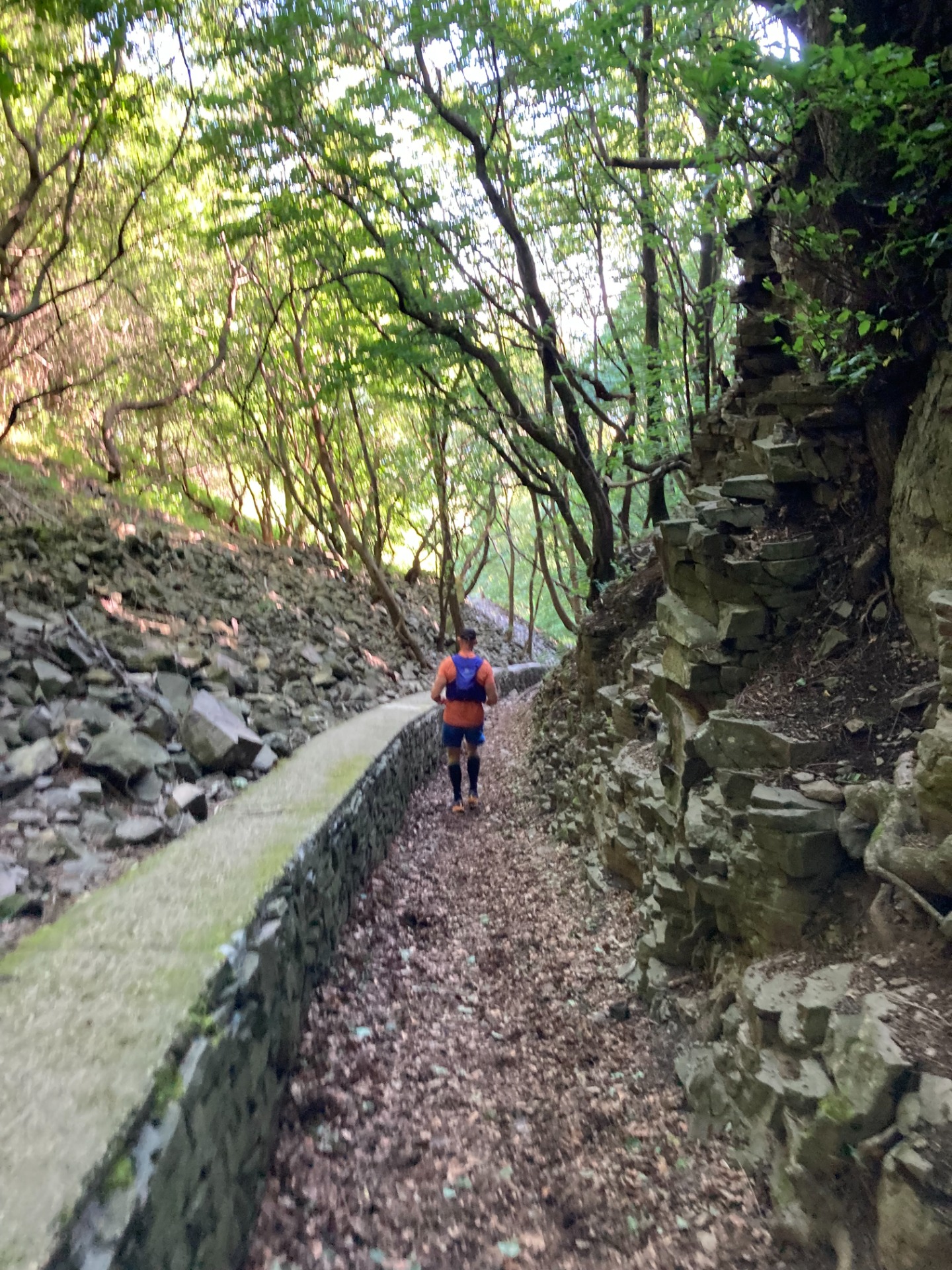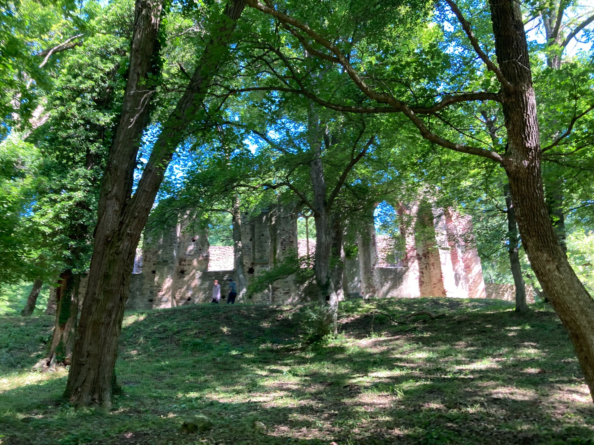 Felmásztunk a Folly-arborétum fölé, majd balra befordultunk az erdőbe és régi pincék romjai mellett futottunk a Pálos kolostorromig.