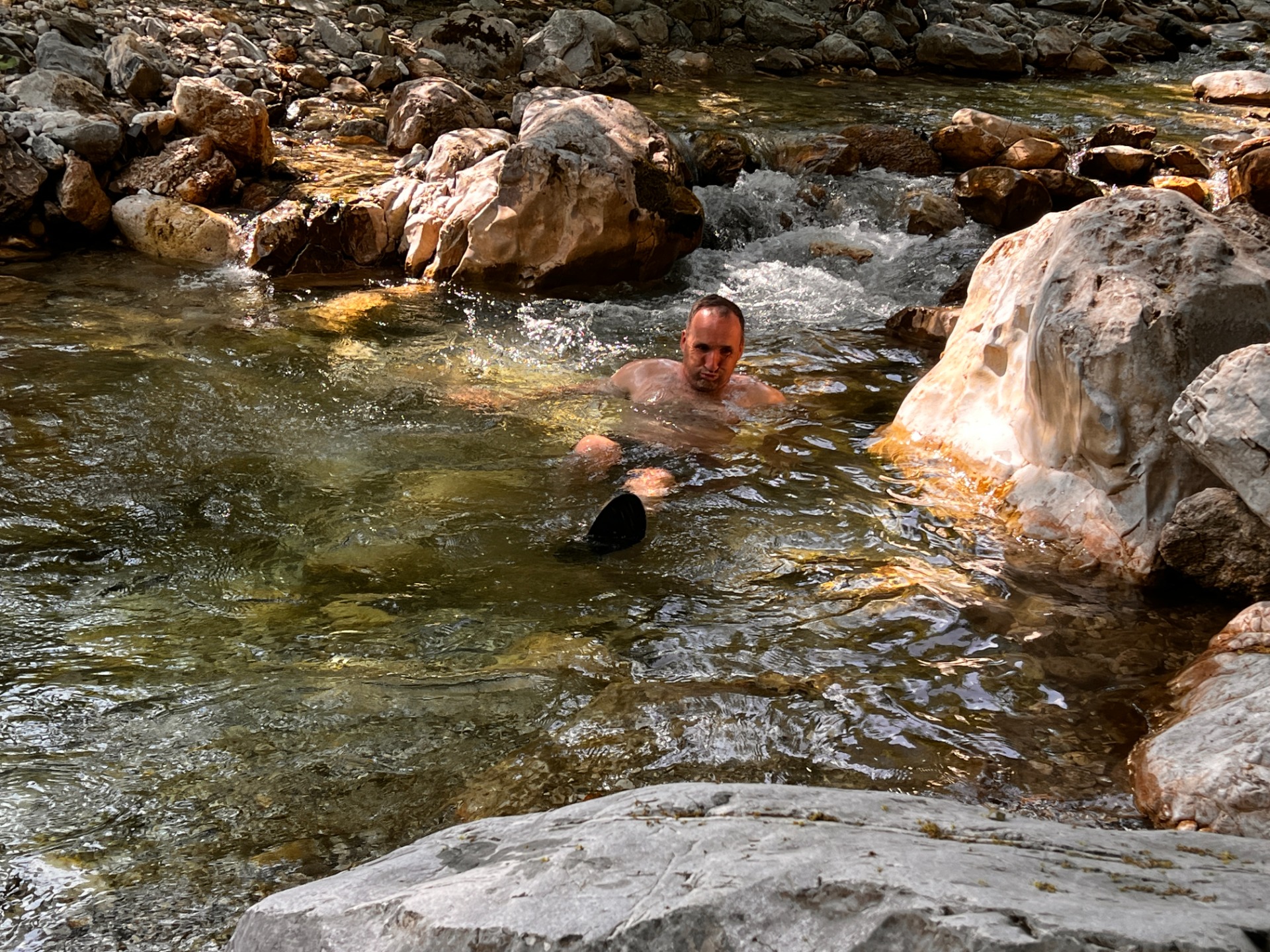 A hosszú lefelé után következett a napi fürdés, itt a forrás közelsége miatt csupán 6 fokos volt a patak vize, de ez nem akadályozott meg bennünket a fürdésben, mondhatni frissítő élmény volt.