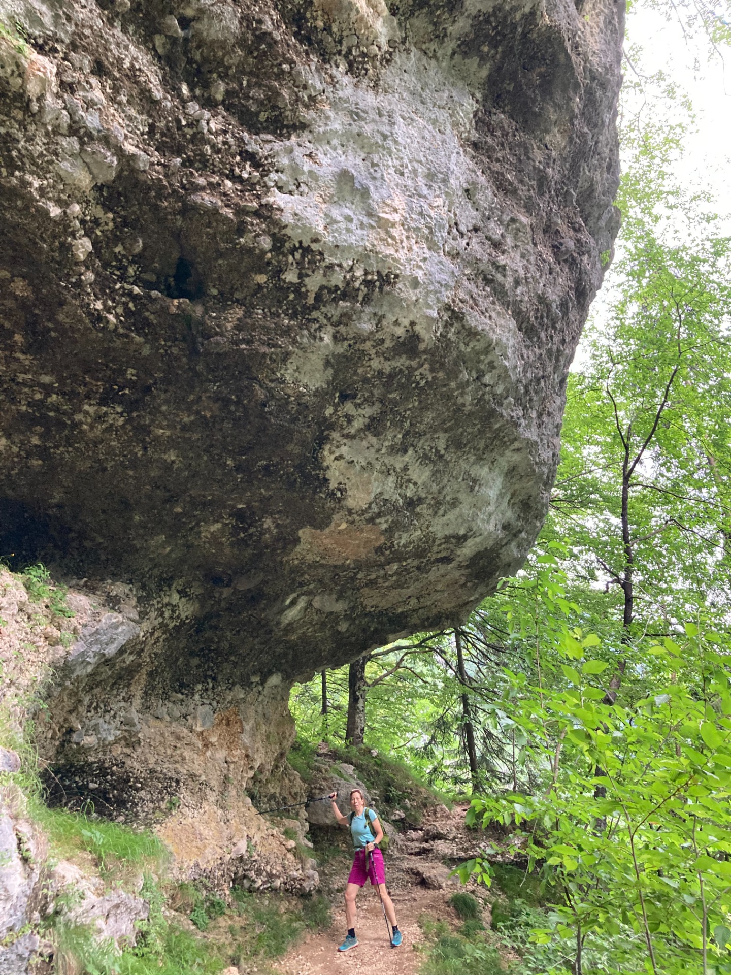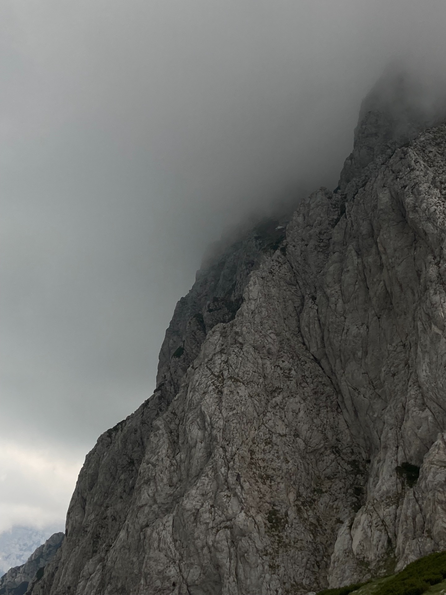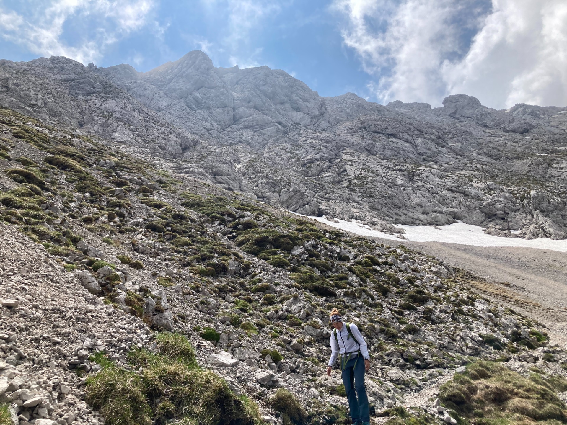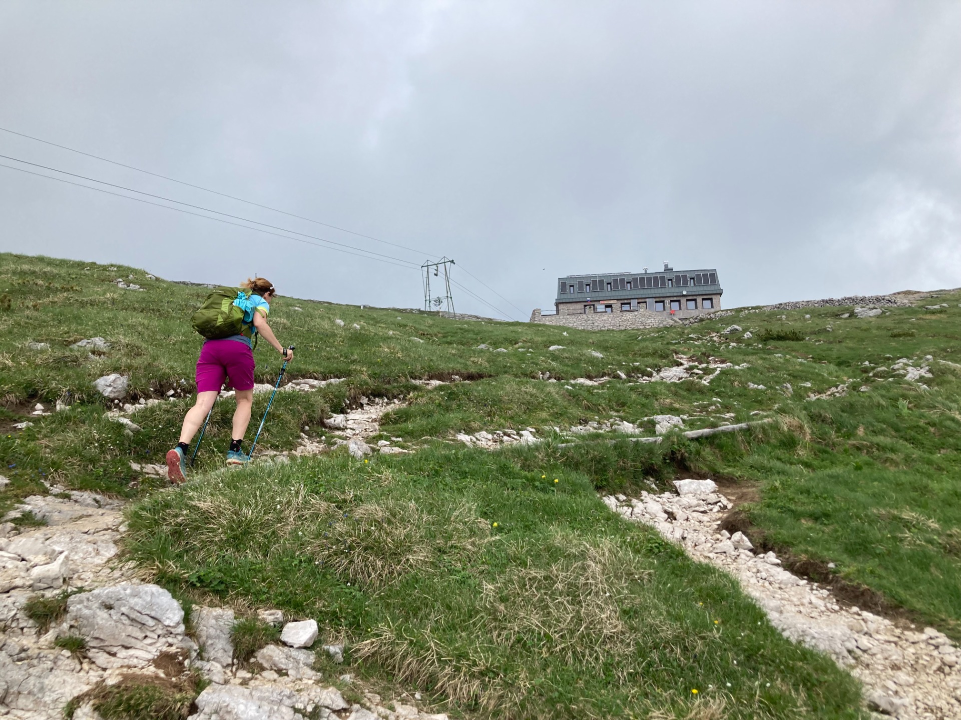 Erős kaptatóval indultunk felfelé, hatalmas mészkőfal alatt, majd felett vitt az út, kisvártatva a hágóban lévő menedékházhoz vezető teherlift alsó állomását érintettük.