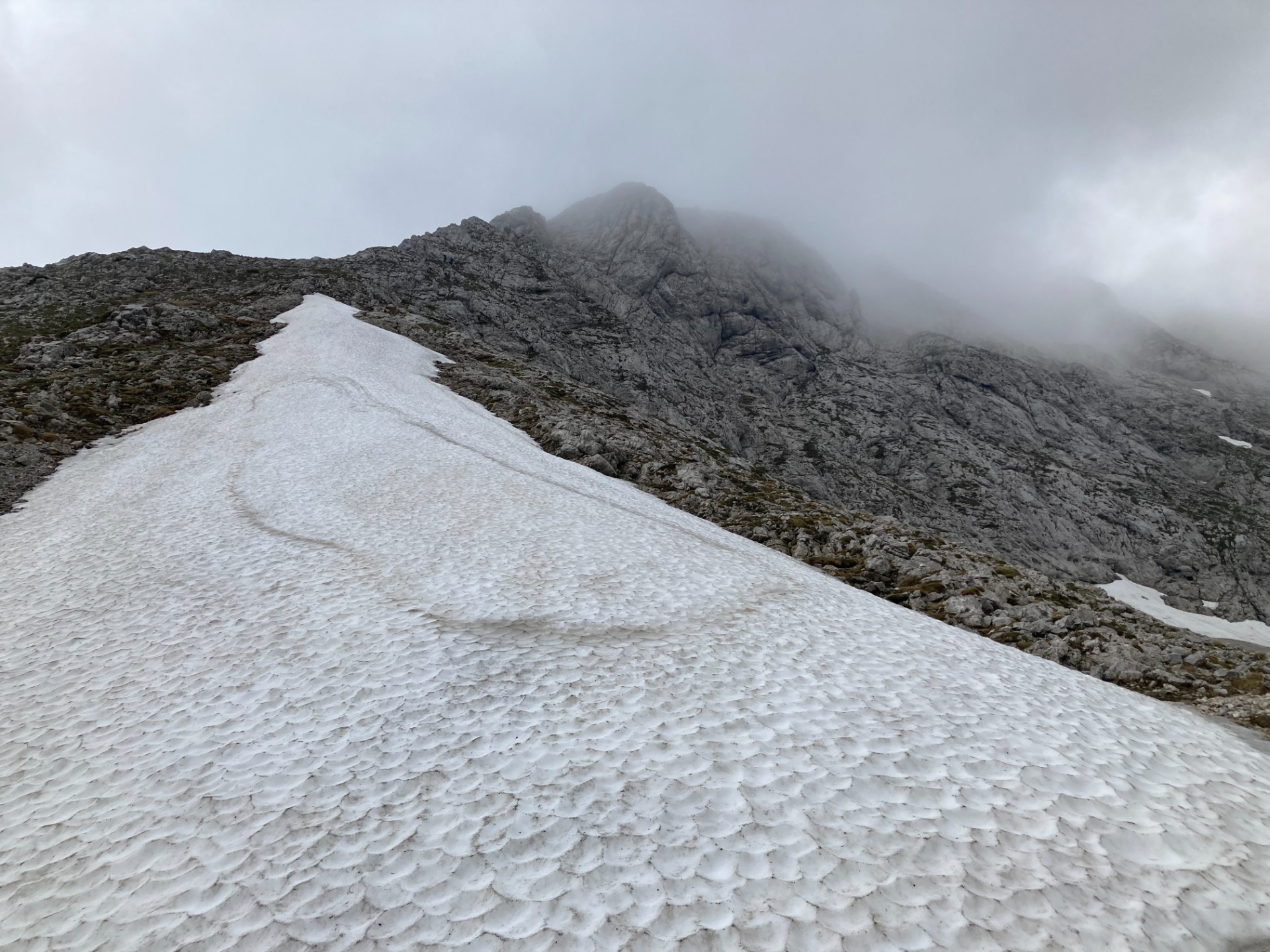Azt aztán hamar láttuk, hogy a jelölt út még vastag hó alatt van és alternatívaként egy meredek törmeléklejtőn kellene átkelni, kis mérlegelés után 2000 méteres magasságból inkább visszafordultunk.