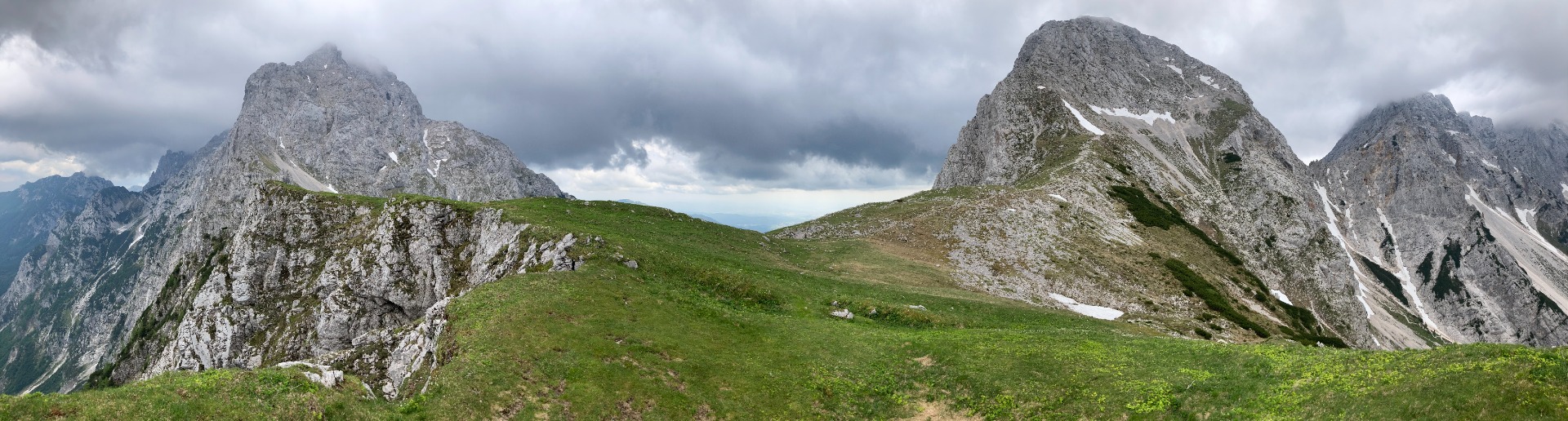 Közben megnéztük az itt legelésző és kolompoló tehenet és bociját. Azt terveztük, hogy a valószínűleg jóval forgalmasabb Grintovec felé vezető útvonal helyett a kamniki-hágón át a 2253 méter magas Braná csúcsra mászunk fel.