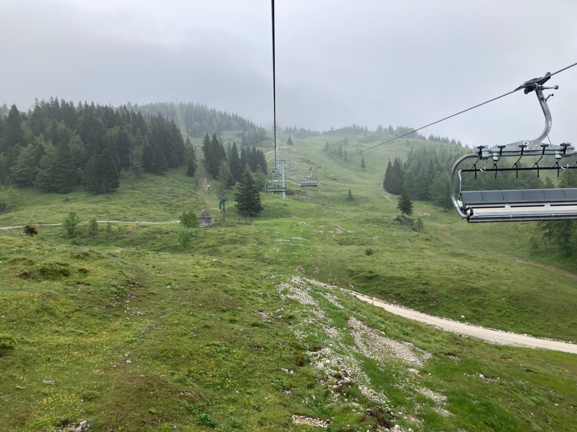 A nagy kabinos felvonó 5 perc alatt ér a fennsík szélére, innen egy négyszemélyes ülőlifttel mentünk tovább, ami persze csurom vizes volt, annak ellenére, hogy a liftkezelő igyekezett letörölgetni, mintha dézsába ültünk volna.