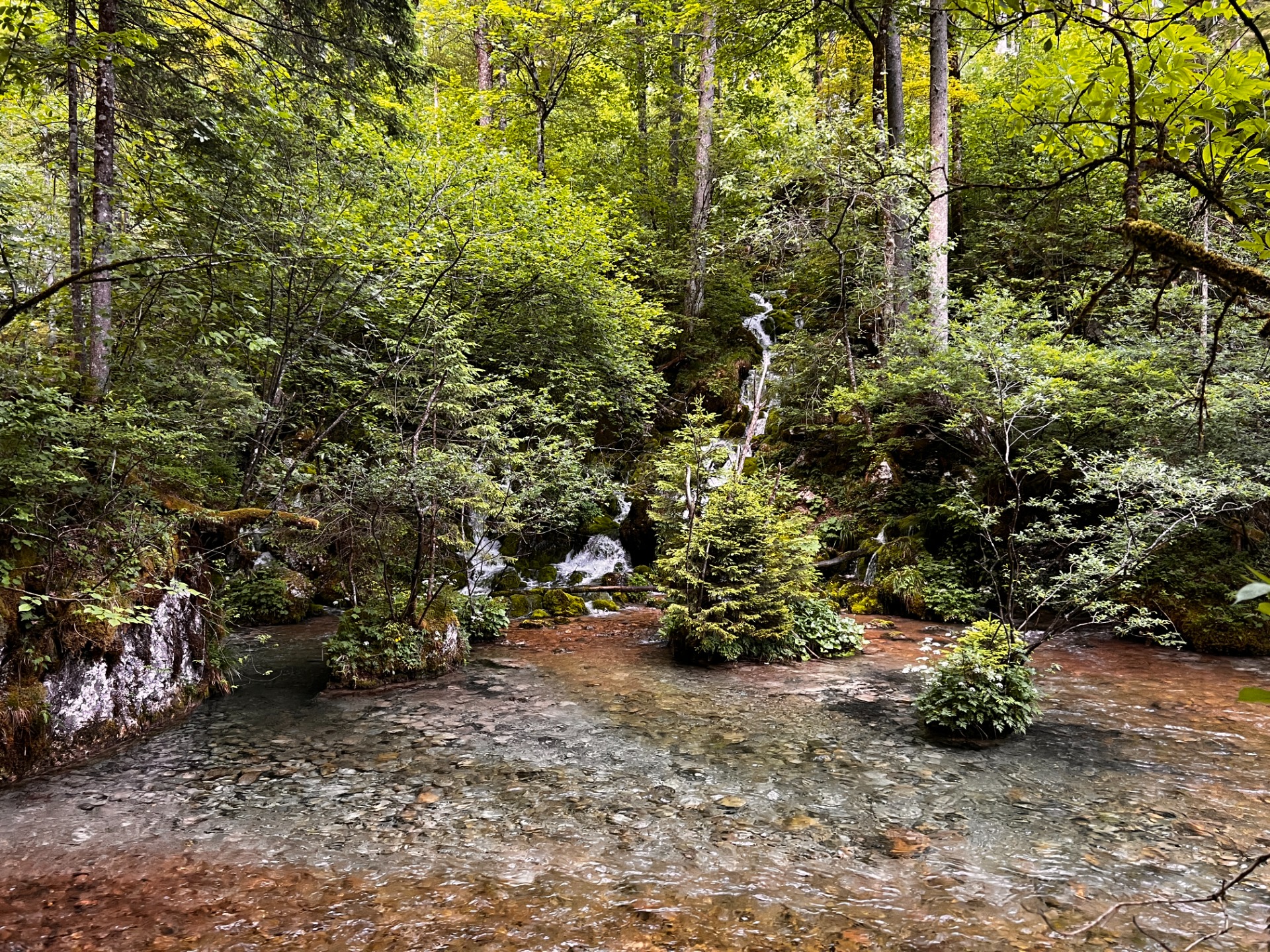 A mészkőhegységek elnyelik a csapadékvíz legjavát, amelyek aztán a hegyek aljában bővizű források képében törnek elő. 1415 méter magasságban egy kis pihenőhelyhez értünk, itt kávéztunk egyet és mentünk tovább.