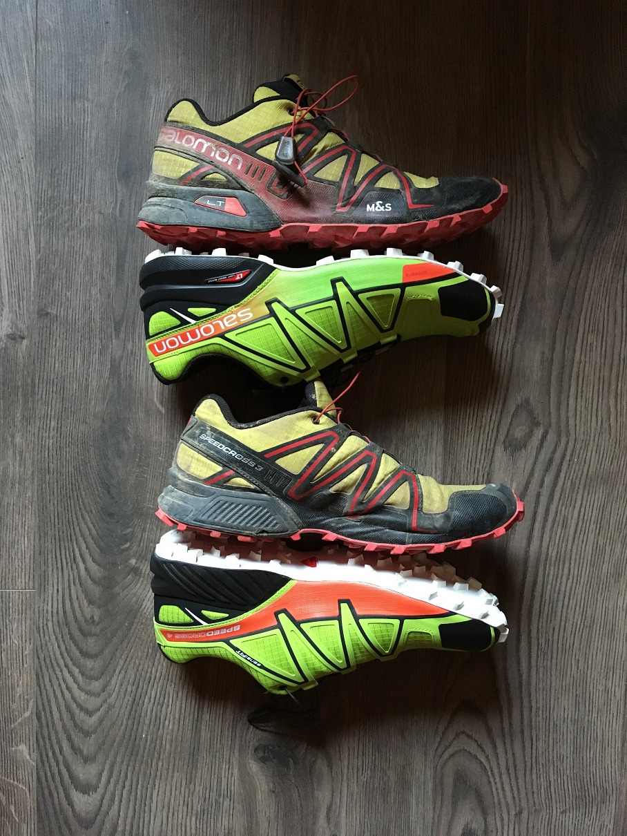 Időközben új cipő is érkezett a terep szekcióba, a sárga Speedcross3-ba másfél év alatt több mint 900 kilométert tettem, a bal felsőrésze erőteljes foszlásnak indult illetve már sok csillapítása sem maradt, a talp bütykei még egészen jó állapotban voltak.