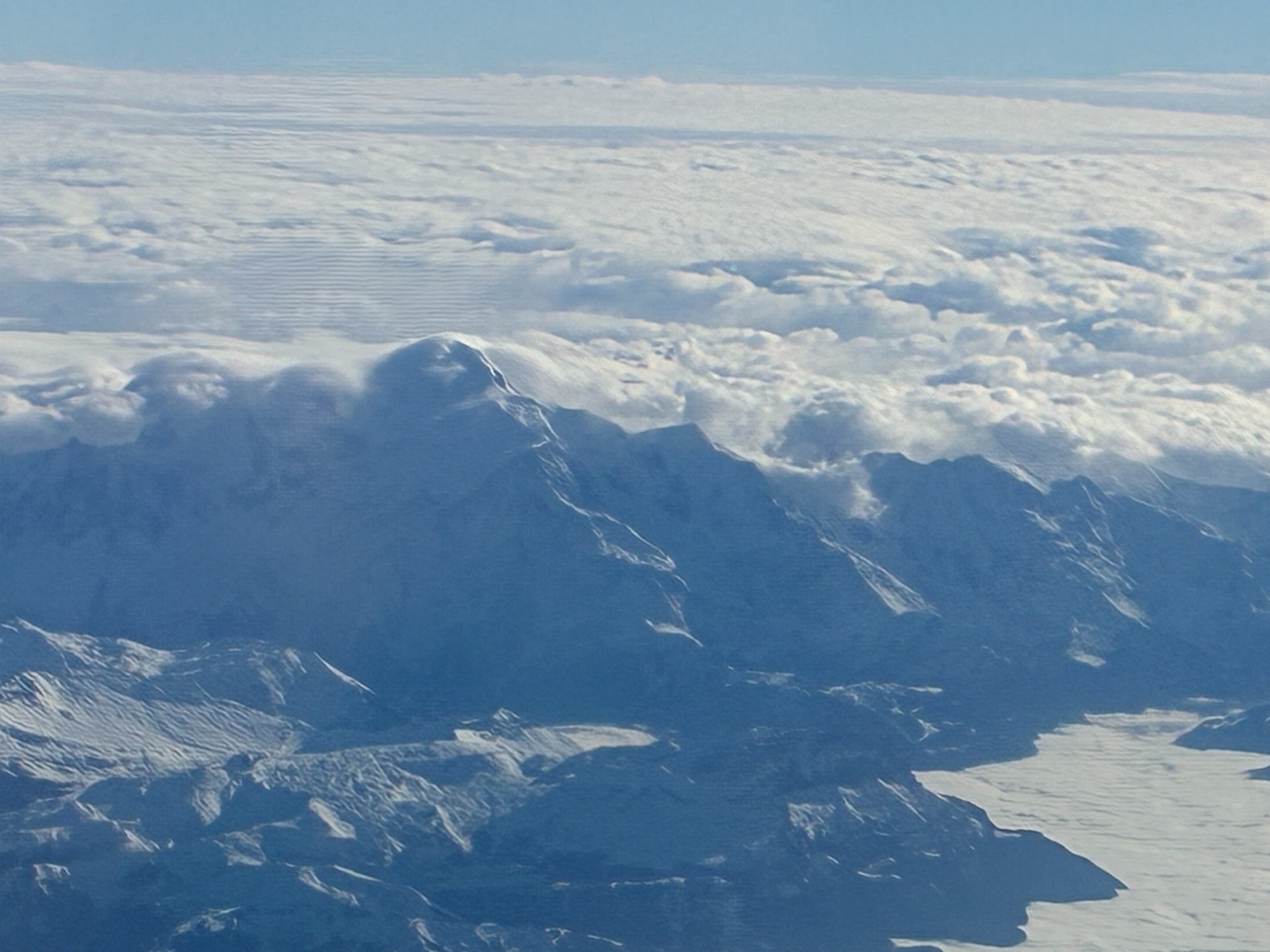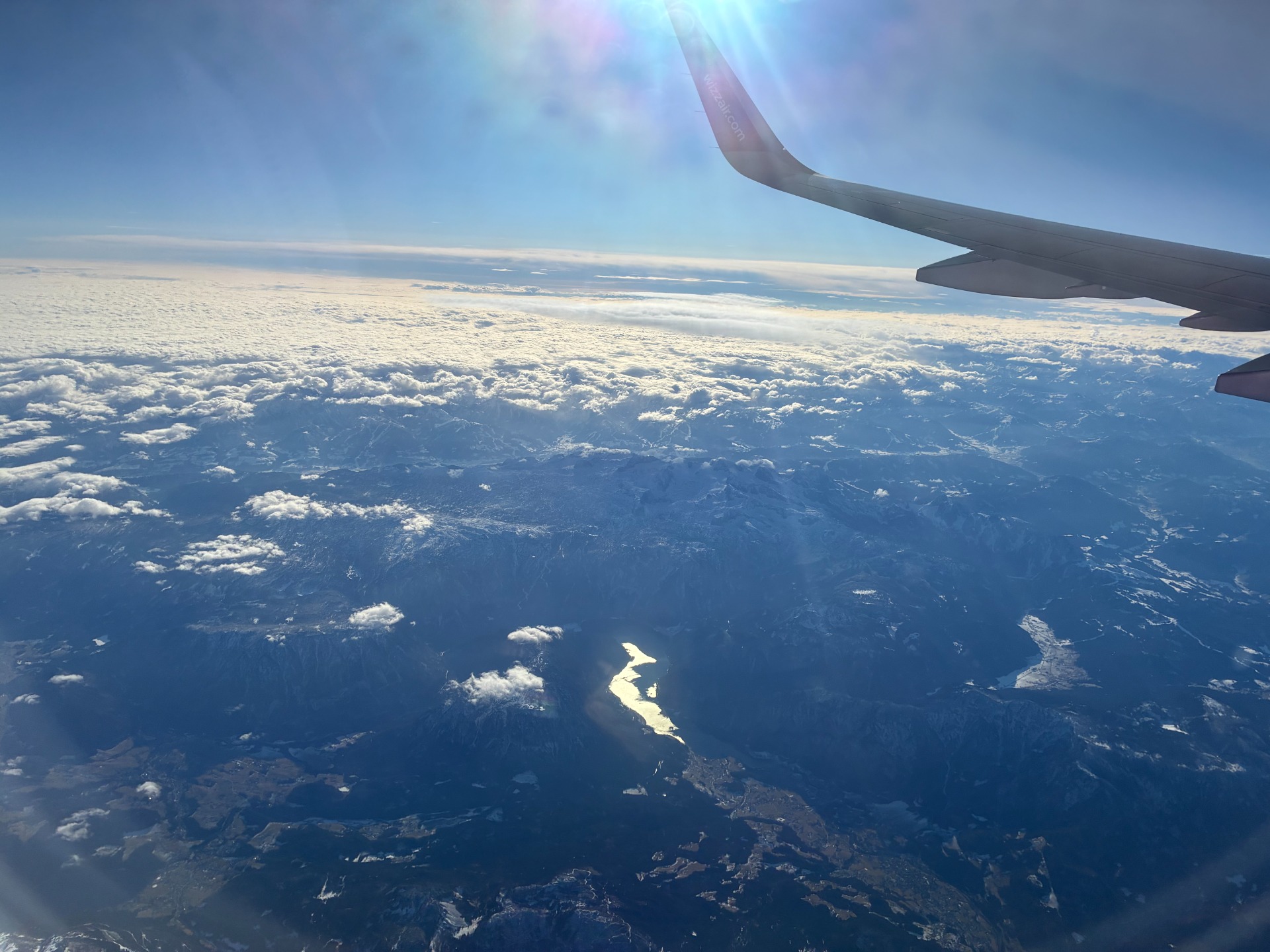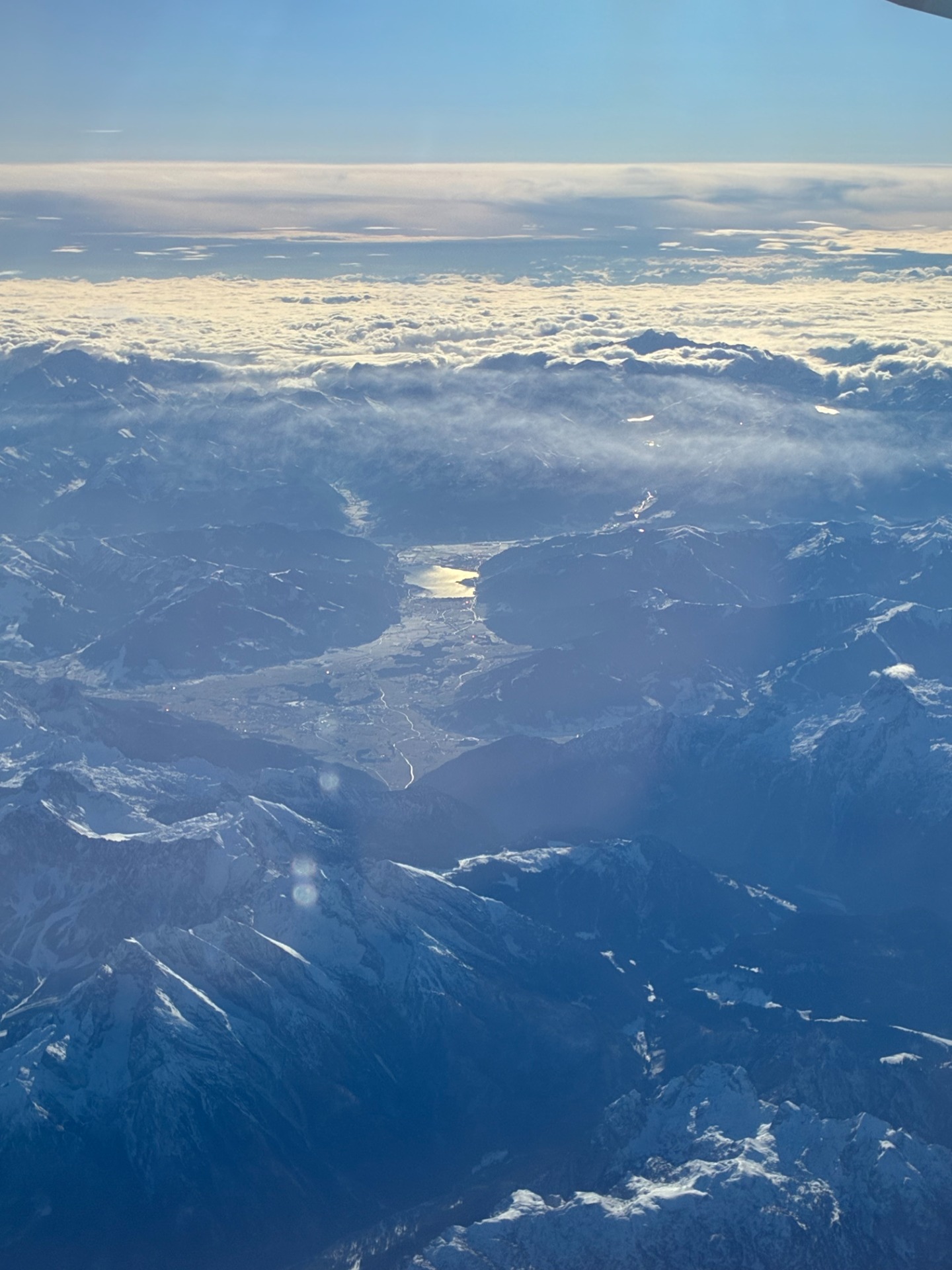 Az odaúton előbb zárt felhőzet felett repültünk, majd előbukkant az Alpok és egy olyan jellegzetes régiója, amelyet bármikor felismerek, az Enns völgye a schladming-i "4 hegy" sípályáival (hátul a felhők alatt), előrébb pedig az évszakhoz képest nagyon gyéren behavazott Dachstein fennsík,a hegyek közé ékelődve pedig a becsillanó jég a sötétlő vizű Hallstatt-i tavon.
