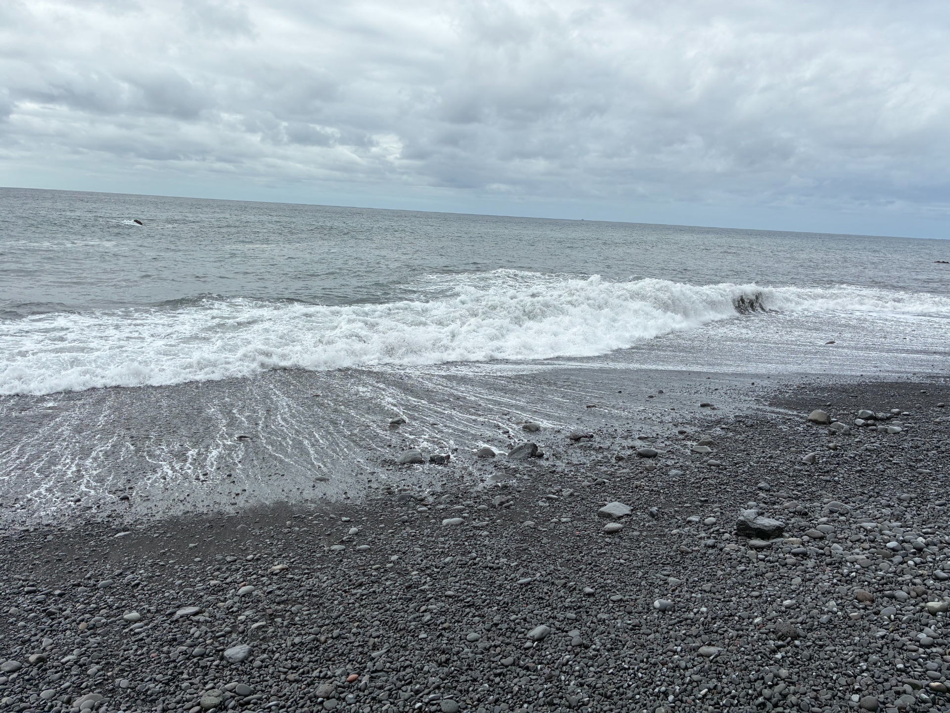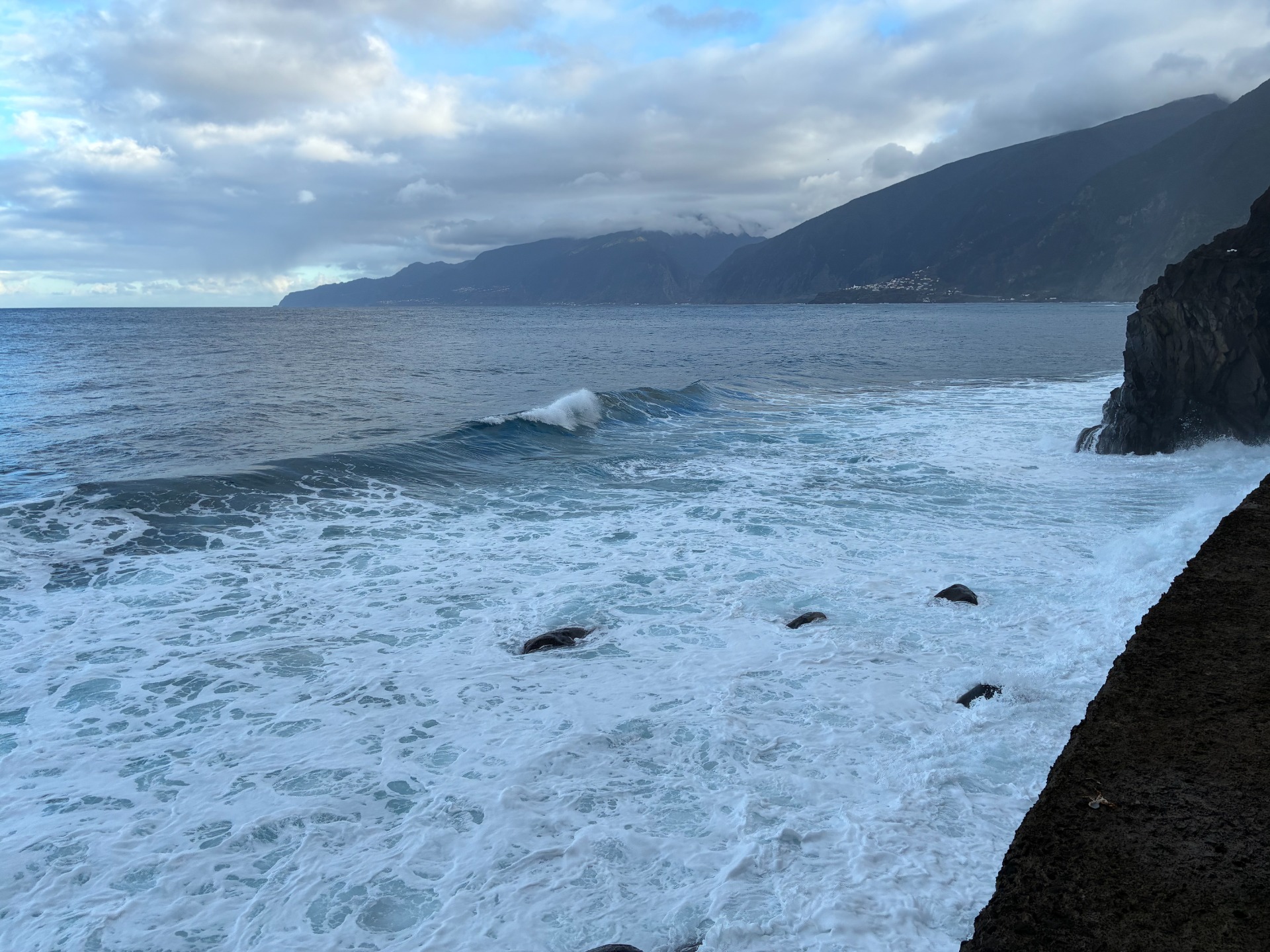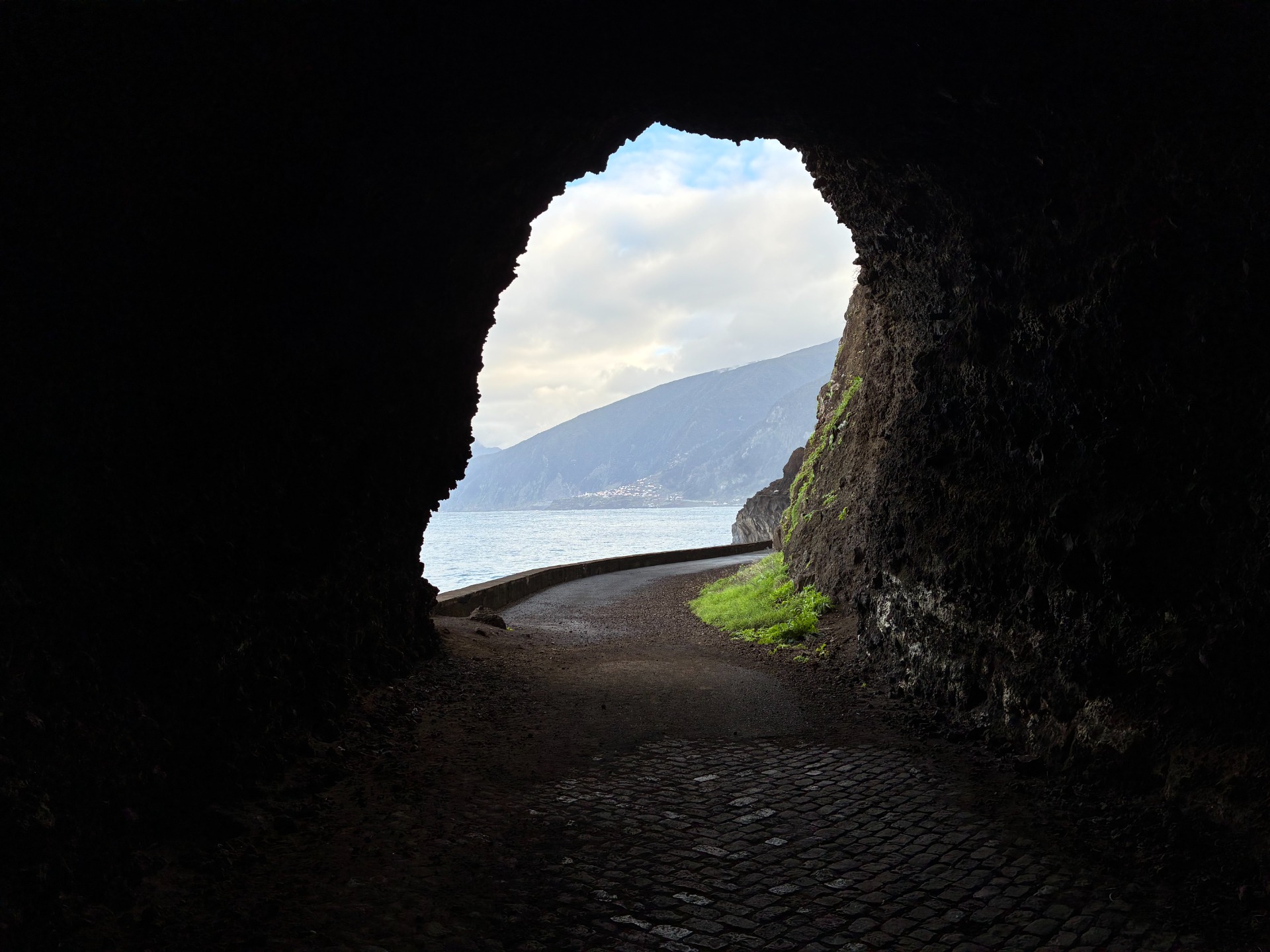 A fennsíkról legurultunk Ribeira da Janela-ba, fentről megnéztük a kilátást, lent a parton pedig átsétáltunk egy a régi parti út részét képező sötét alagúton és a túlvégén megnéztük a hatalmas hullámokat.