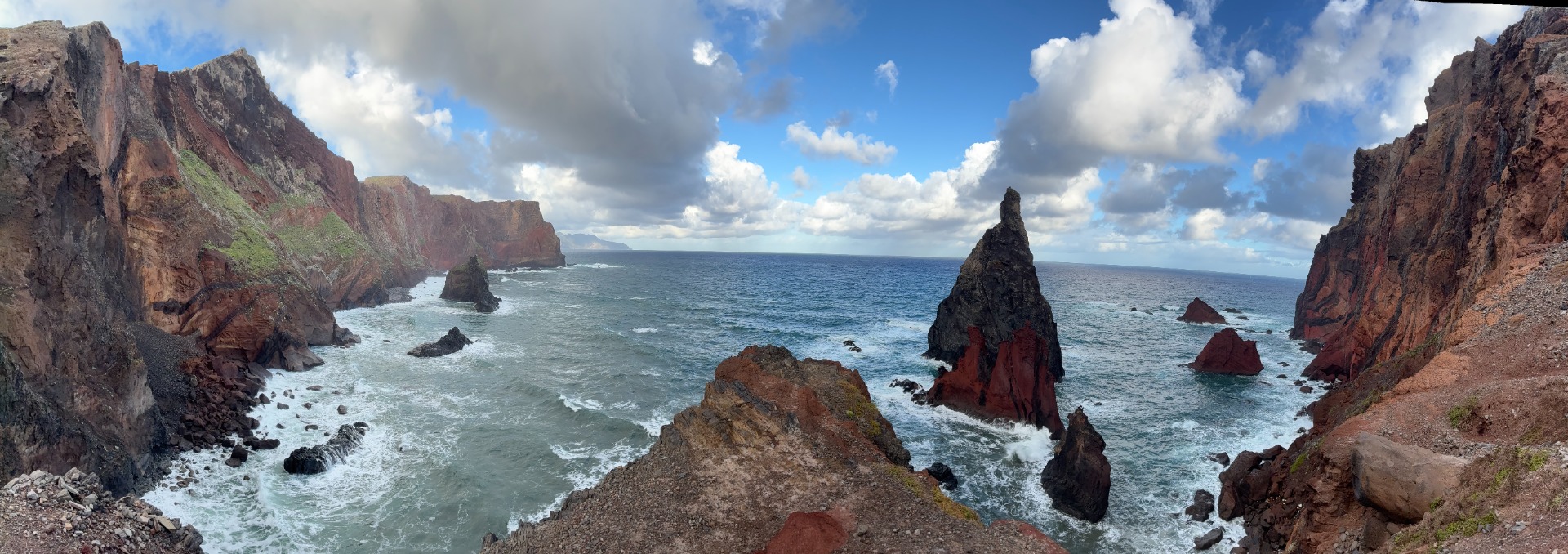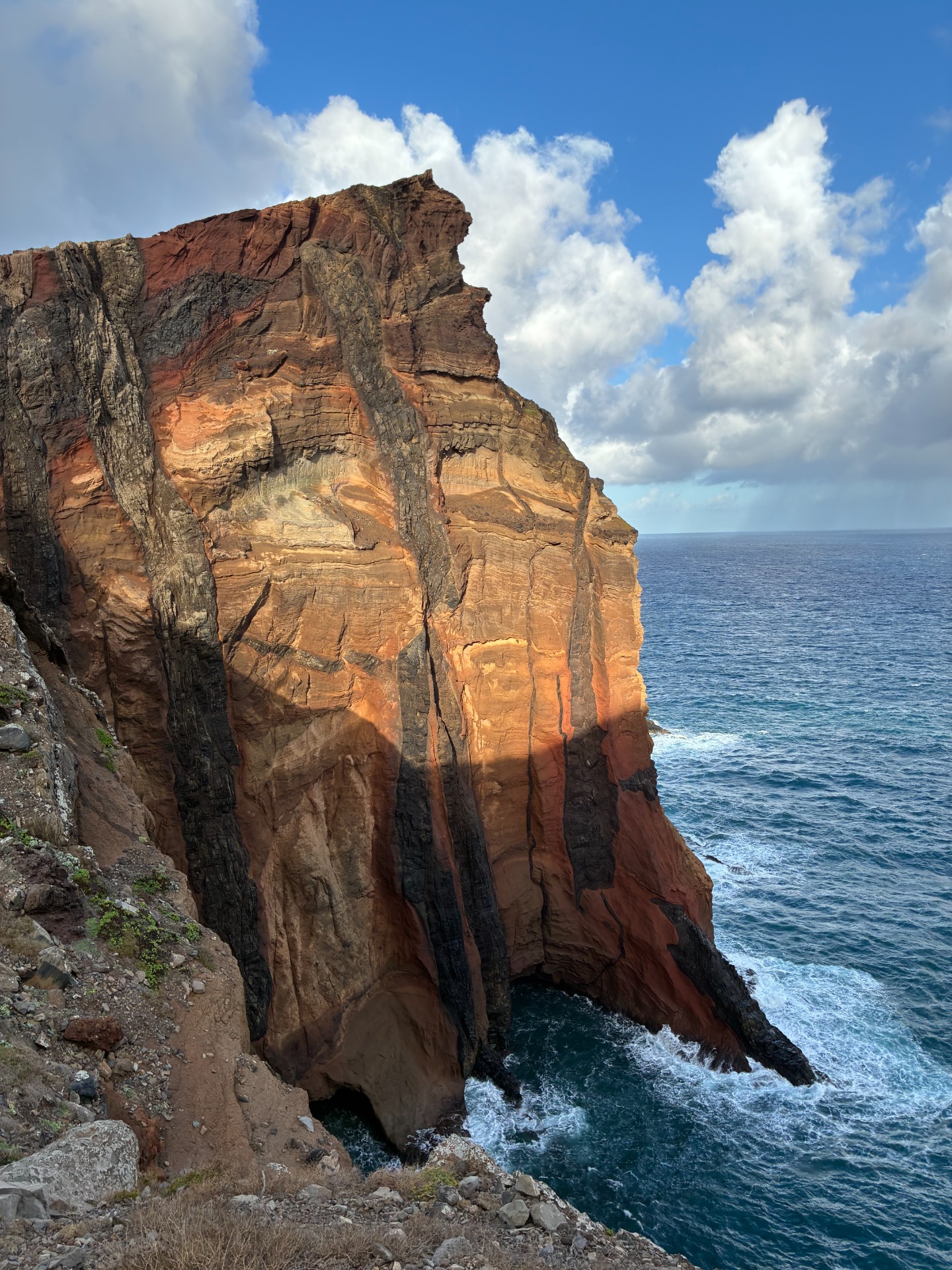A lábunk alatt bömbölő óceáni hullámok durva dörgéssel csapkodták a sziklás partokat, a hatalmas sziklafalak érdekes betekintést engedtek a hajdani geológiai viszonyokba - itt például szépen lehet látni a kipreparálódott lávacsatornákat és a belemerevedett szürke bazaltot. A félsziget java részét a bazalt mellett vulkáni tufa és breccsa, valamint szélhordta vörös homokkő alkotja.