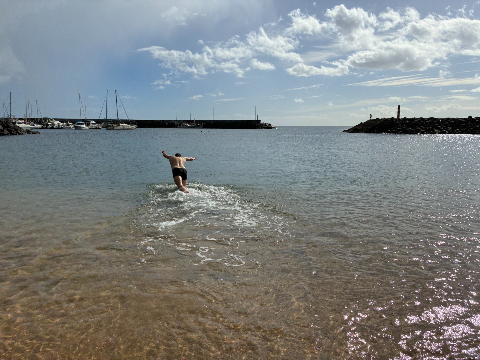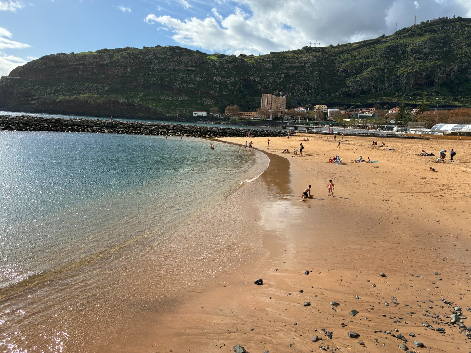 Innen az izzadt mivoltunkat a közeli Machico homokos strandjára vittük át, ahol csobbantunk egyet a 19-20 fok körüli óceánban. A sárga homokot persze úgy hozták a szigetre, mivel itt a természetes strandokon fekete kövek és fekete homok van a sziget vulkáni mivoltából adódóan.