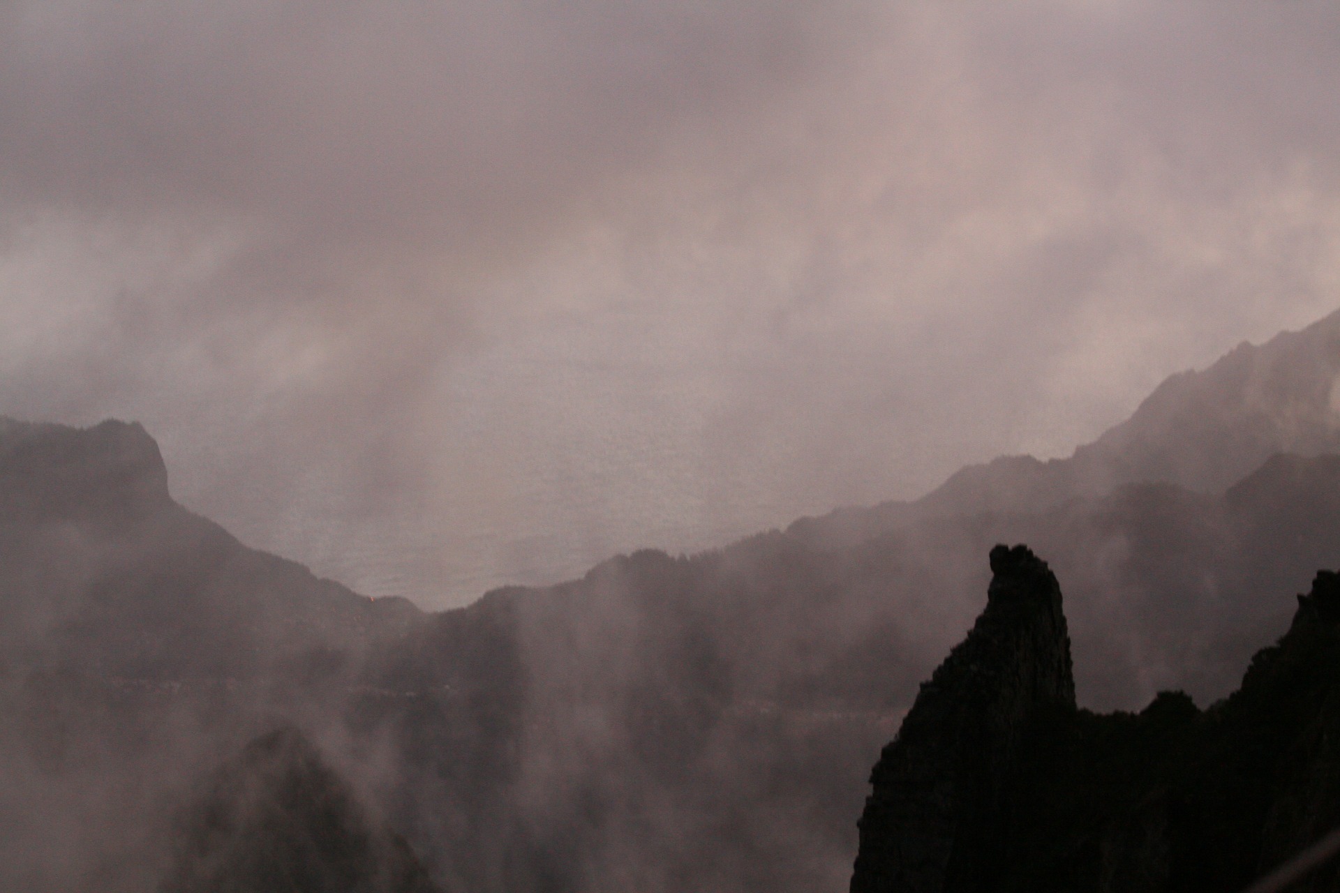 Felérve persze felhőben voltunk és 1 fokot mutatott az autó hőmérője, ehhez jött még az erős szél. A Pico Areeiro 1818 méter magas csúcsán voltunk.