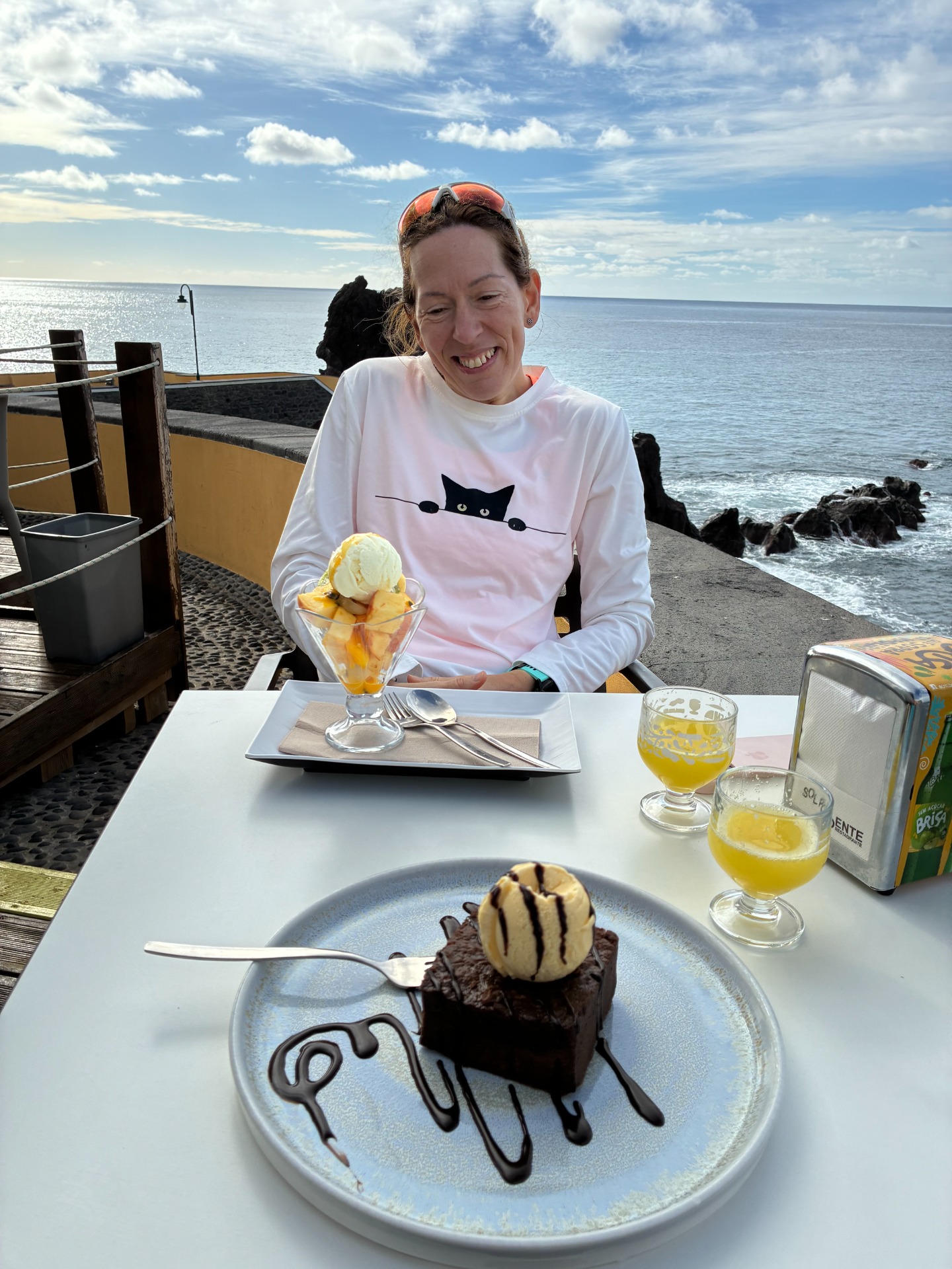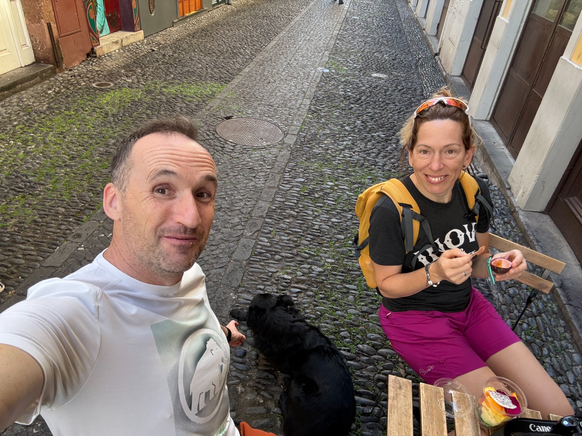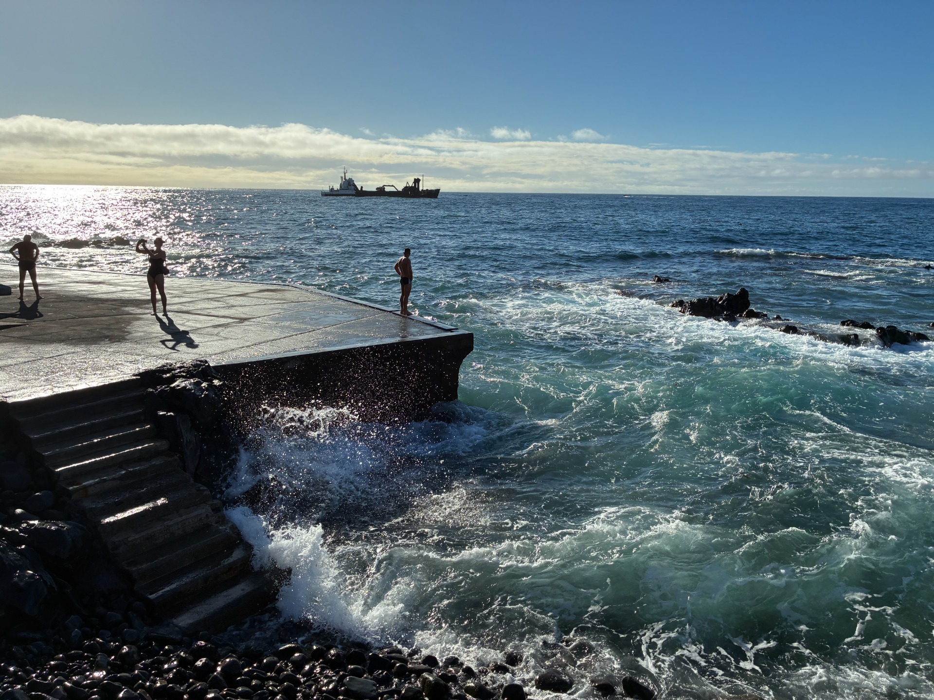 A futás után Ponta do Sol-ban egy alagútban levő parkolóban becipőkanalaztam a fiatot egy lehetetlenül kis helyre, majd a sziklaszirtre épült bárban sütiztünk éééés poncháztunk.