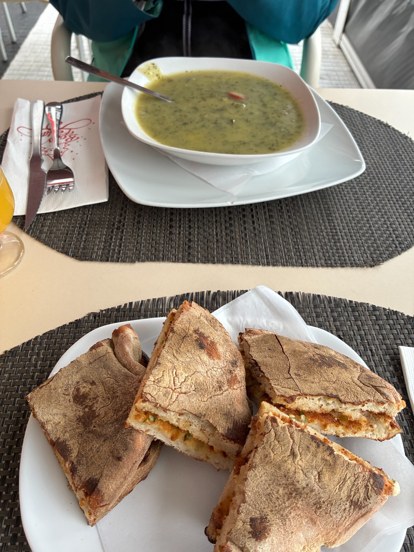 Vacsora tekintetében a szemerkélő eső miatt a korábbi kedvencnek kijelölt éttermünket céloztuk meg, ahol Zsuzsi végre megkóstolta a helyi különlegességeket, mint a "zöld leves", ez egy igen finom káposztás, brokkolis, krumplis zöldség krémleves, én a szintén helyi jellegzetességnek számító kövön sütött kör alakú fokhagymás kenyeret ettem, majd következett a sült banán körettel készült espada filé.