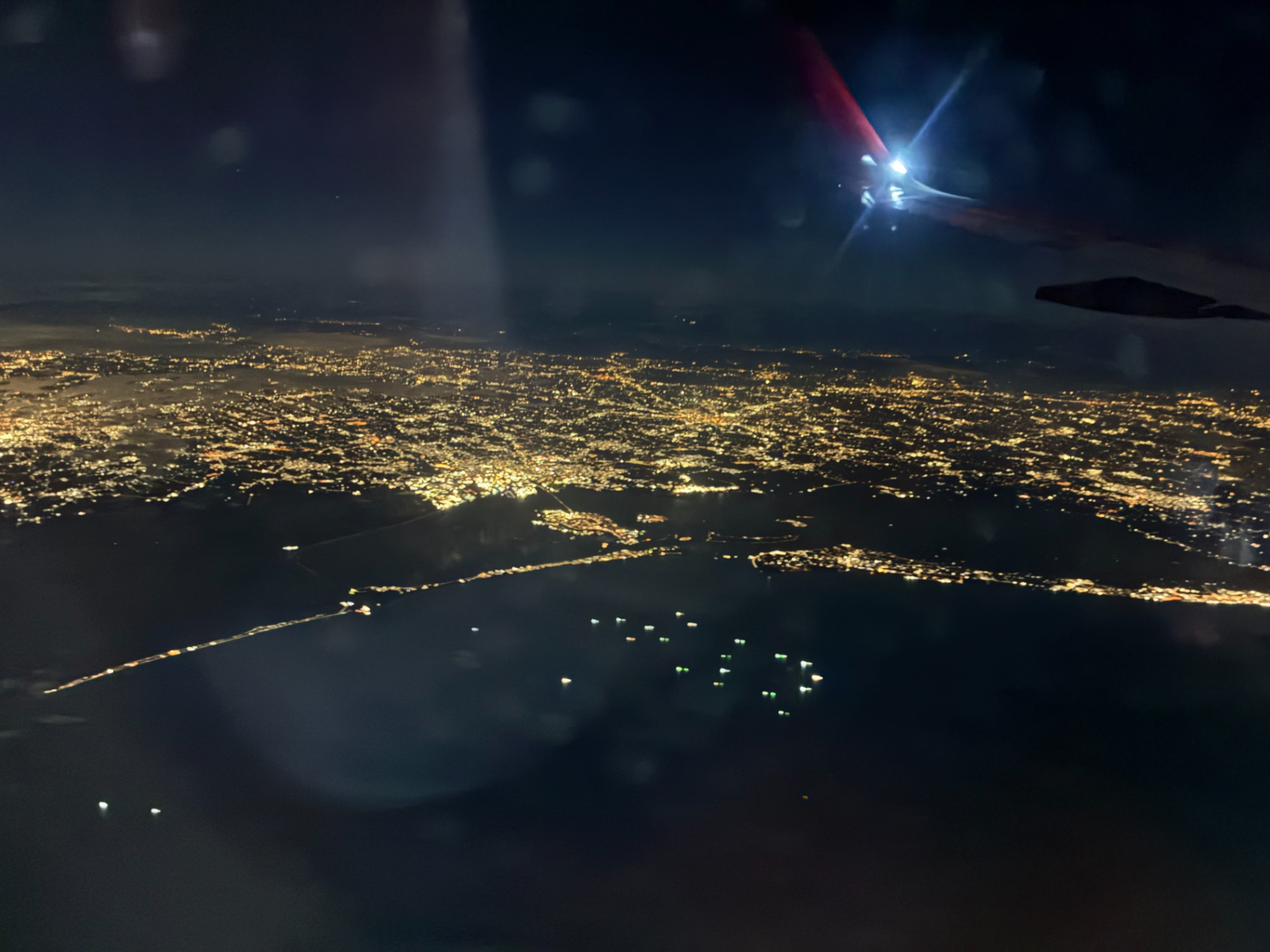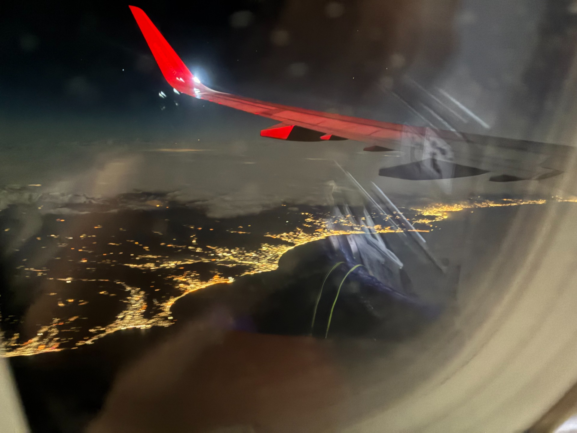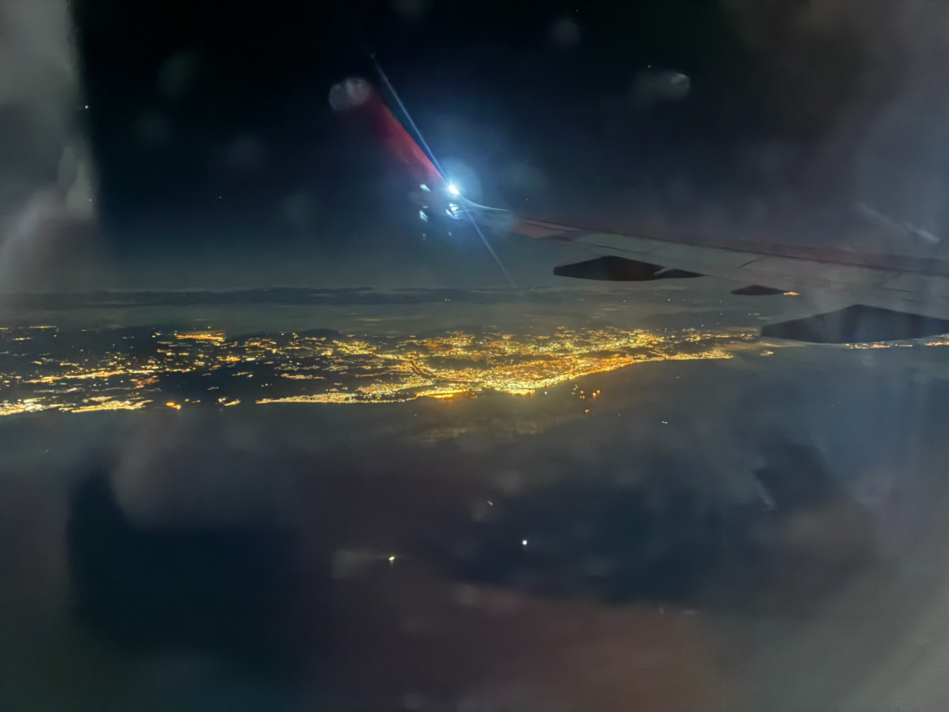 A reptéren a helyi kitelepült bár barátságos személyzetével spanoltunk és ittunk egy eddig nem próbált ananászos ponchát (mert a ponchának vannak ilyen alfajai), nézztük a le és felszálló gépeket, sötétedés előtt leszállt a Budapestről érkező gép is, majd kis műszaki hibaelhárítás miatti késés után este nyolc körül elhagytuk a szigetet. A hazaúton a lenti fények alapján próbáltam azonosítani hol járunk, így lőttem pár rossz képet az ablakból.